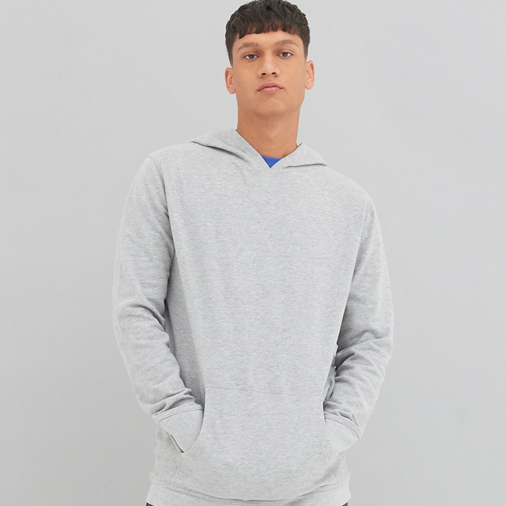 Soft peached fabric with brushed inner, fashion fit, drop shoulder style, hood with no drawcord.