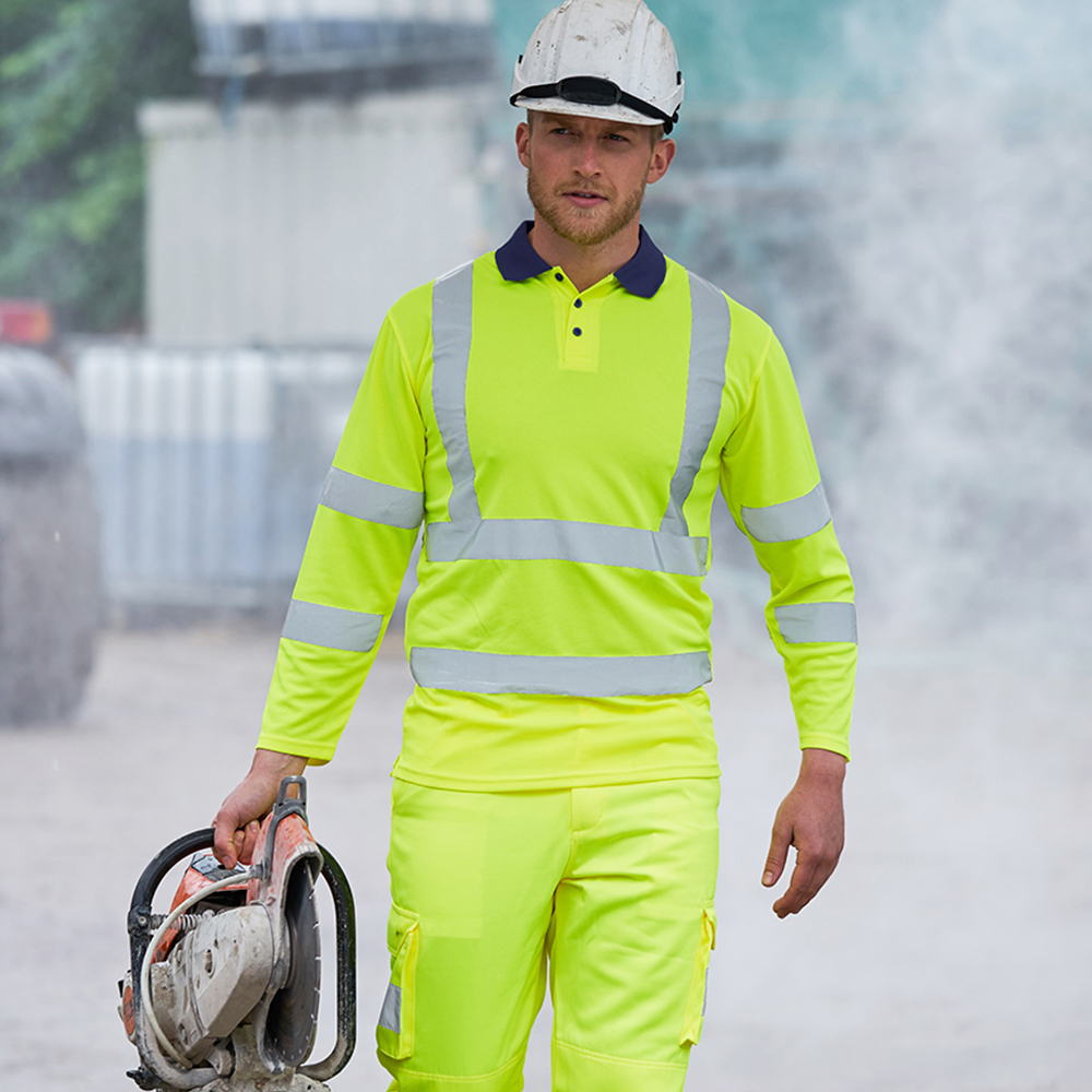 150 gsm, 100% textured polyester, conforms to EN ISO 20471: 2013 + A1: 2016 class 3, RIS-3279-TOM (orange/navy only), lightweight breathable birdseye fabric, contrast ribbed collar, contrast three button placket, two reflective bands on front, back, around sleeves and one over each shoulder, side vents, twin needle stitching.