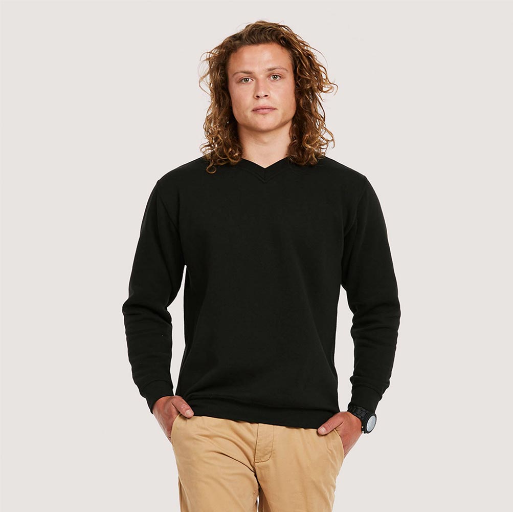 300GSM, 50/50 poly/cotton, reactive dyed, V-nech, set in sleeve, Lycra ribbed cuffs, welt, & neck, twin needle stitching throughout, washable at 60 degrees