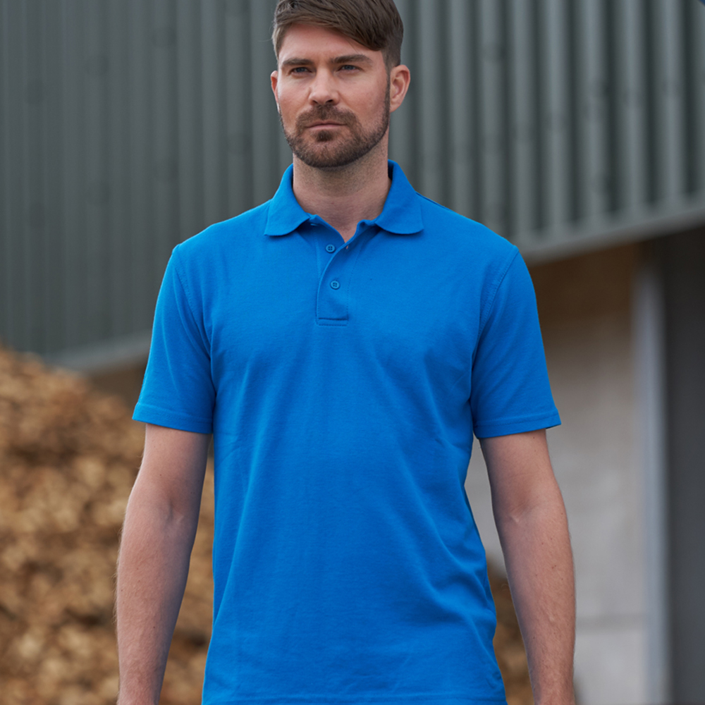 220 gsm, 50% polyester/50% cotton, ribbed collar, taped neck, three self colour button placket, twin needle stitching.