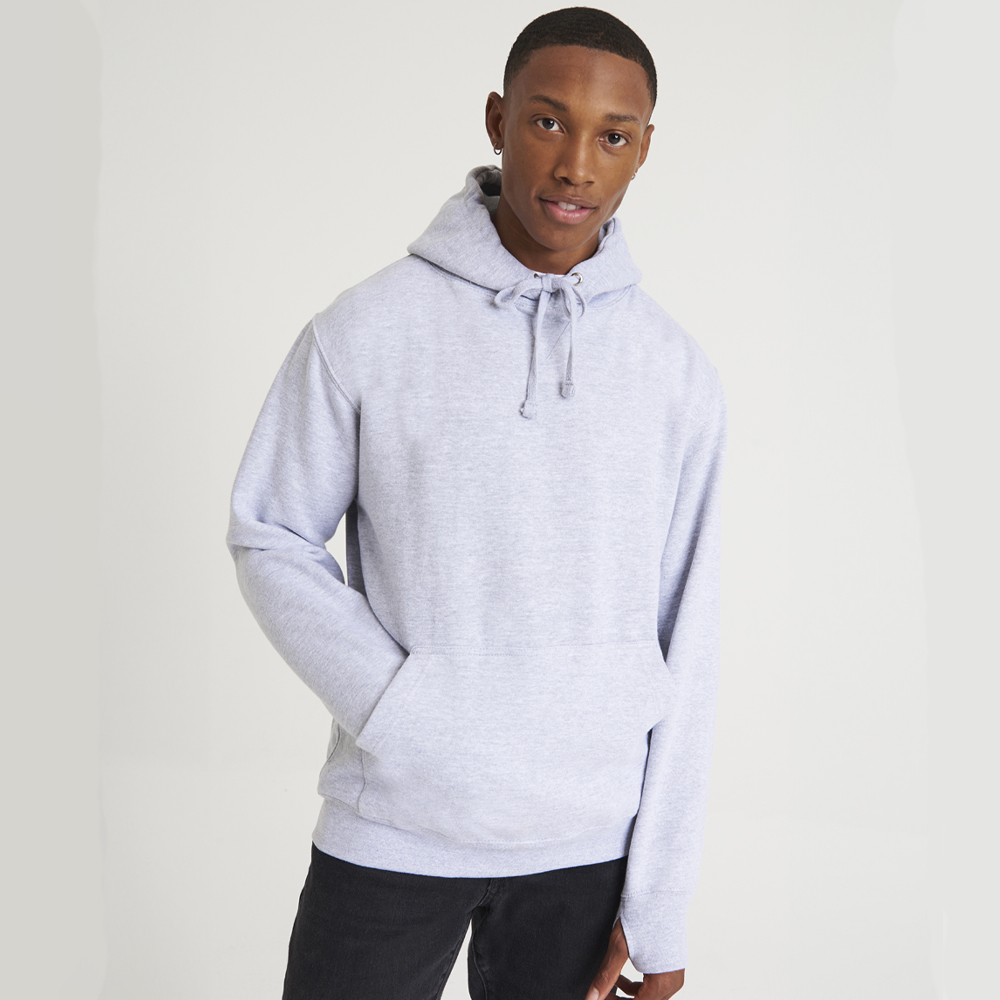 330GSM, 70% ringspun cotton/30% polyester, Soft cotton faced fabric, Brushed back fleece, Drop shoulder style, Three panel double fabric hood with self colour flat lace drawcord, V neck insert detail, Hanging loop at back of neck, Front pouch pocket with hidden media pocket and small opening for ear phone cord feed, Hidden ear phone loops, Ribbed cuffs and hem, Thumbholes on cuffs, Twin needle stitching.