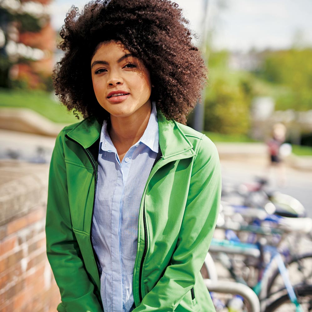 300GSM, 96/4% polyester/elastane, three layer woven soft shell, Polyester fleece backed, waterproof and wind resistant membrane,ATL durable showerproof finish, breathable, shaped fit, full length zip with inner zip guard, panel detail on right chest, right chest zip pocket, two front zip pockets, open cuffs, adjustable hem